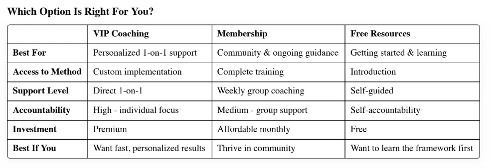 VIP Coaching gives you 1-on-1 personalized implementation with direct access to me. Perfect if you want customized support and fast results. Membership gives you the complete framework training, weekly group coaching, and a supportive community at an affordable price. Both work—it depends on your budget and learning style.